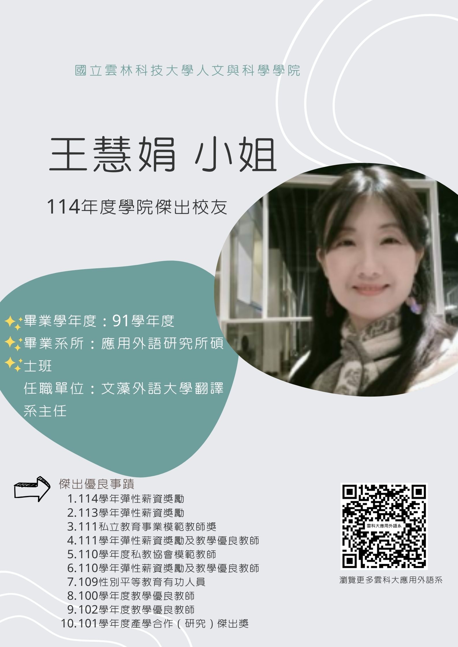 | 王慧娟小姐 | 91學年度 | 應用外語研究所碩士班 | 文藻外語大學翻譯系主任 |
