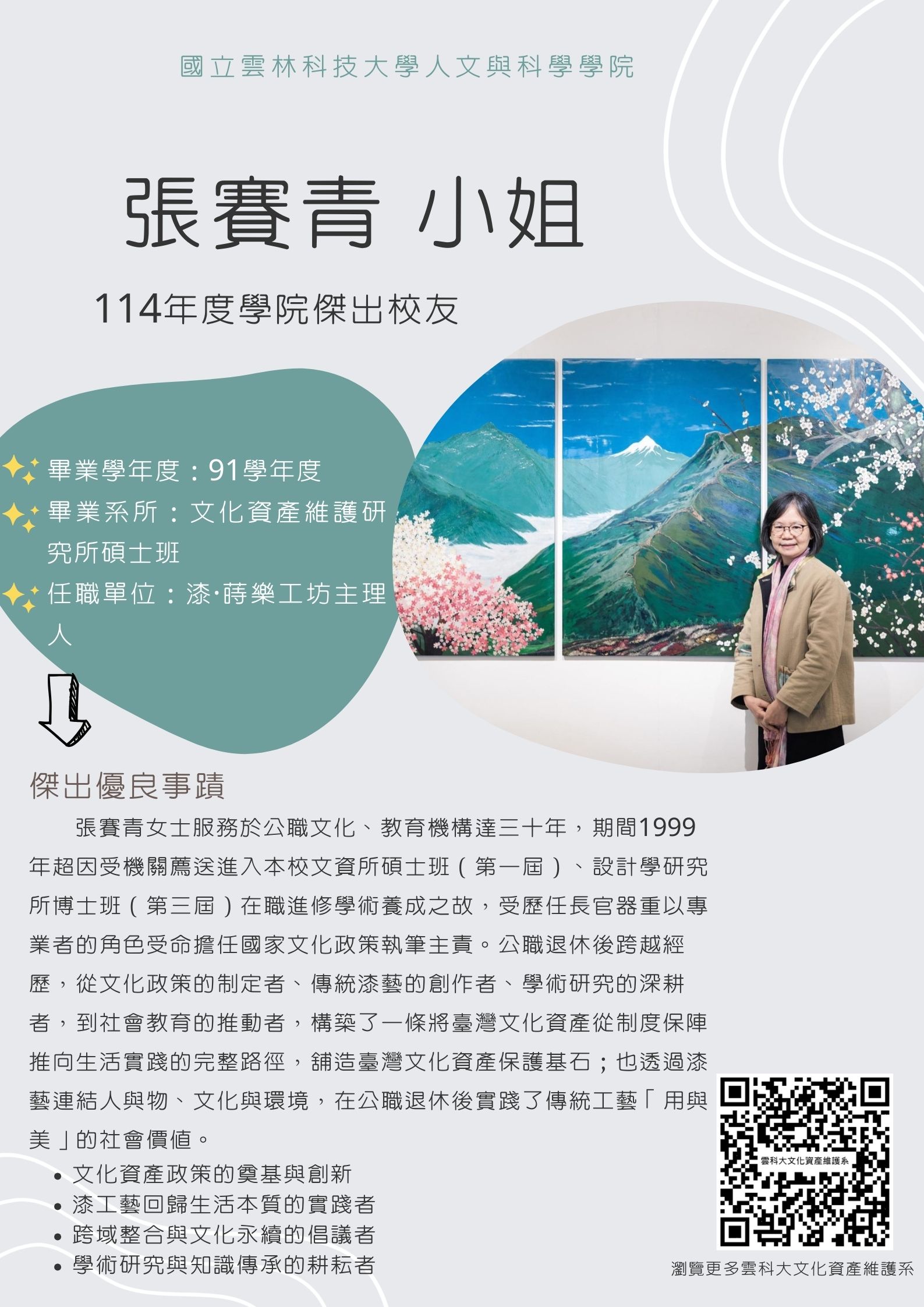 張賽青女士服務於公職文化、教育機構達三十年,期間1999年超因受機關薦送進入本校文資所碩士班(第一屆)、設計學研究所博士班(第三屆)在職進修學術養成之故,受歷任長官器重以專業者的角色受命擔任國家文化政策執筆主責。公職退休後跨越經歷,從文化政策的制定者、傳統漆藝的創作者、學術研究的深耕者,到社會教育的推動者,構築了一條將臺灣文化資產從制度保陣推向生活實踐的完整路徑,舖造臺灣文化資產保護基石;也透過漆藝連結人與物、文化與環境,在公職退休後實踐了傳統工藝「用與美」的社會價值。