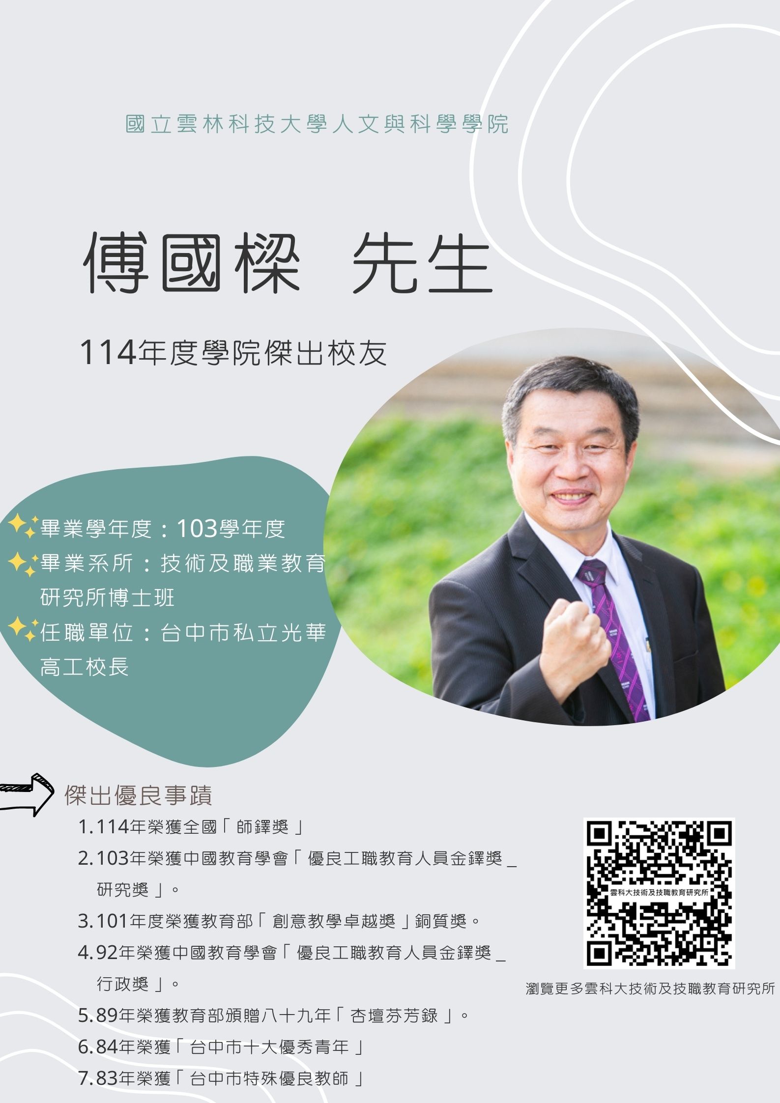 | 傅國樑先生 | 103學年度 | 技術及職業教育研究所博士班 | 台中市私立光華高工校長 |