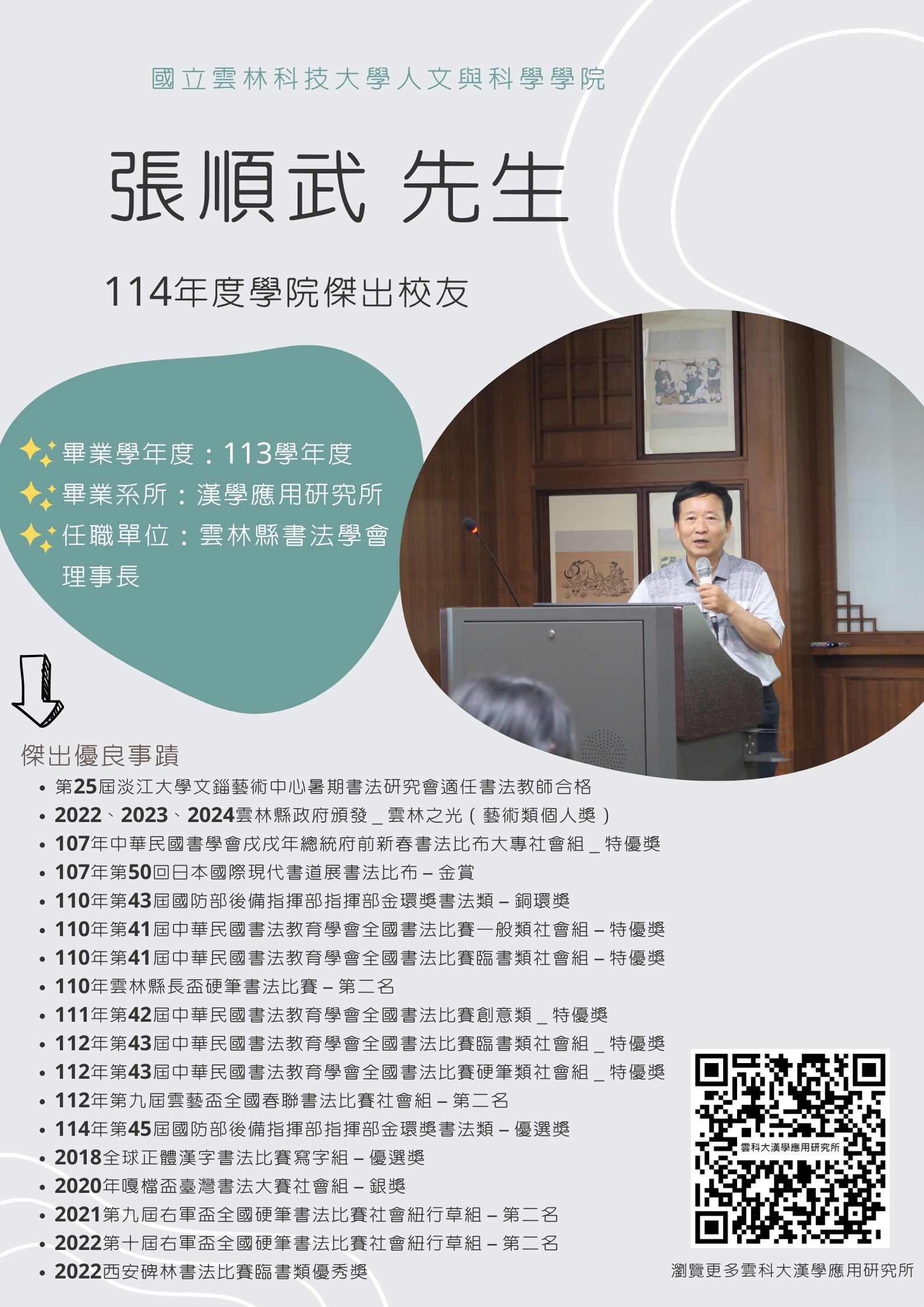 | 張順武先生 | 113學年度 | 漢學應用研究所 | 雲林縣書法學會理事長 |