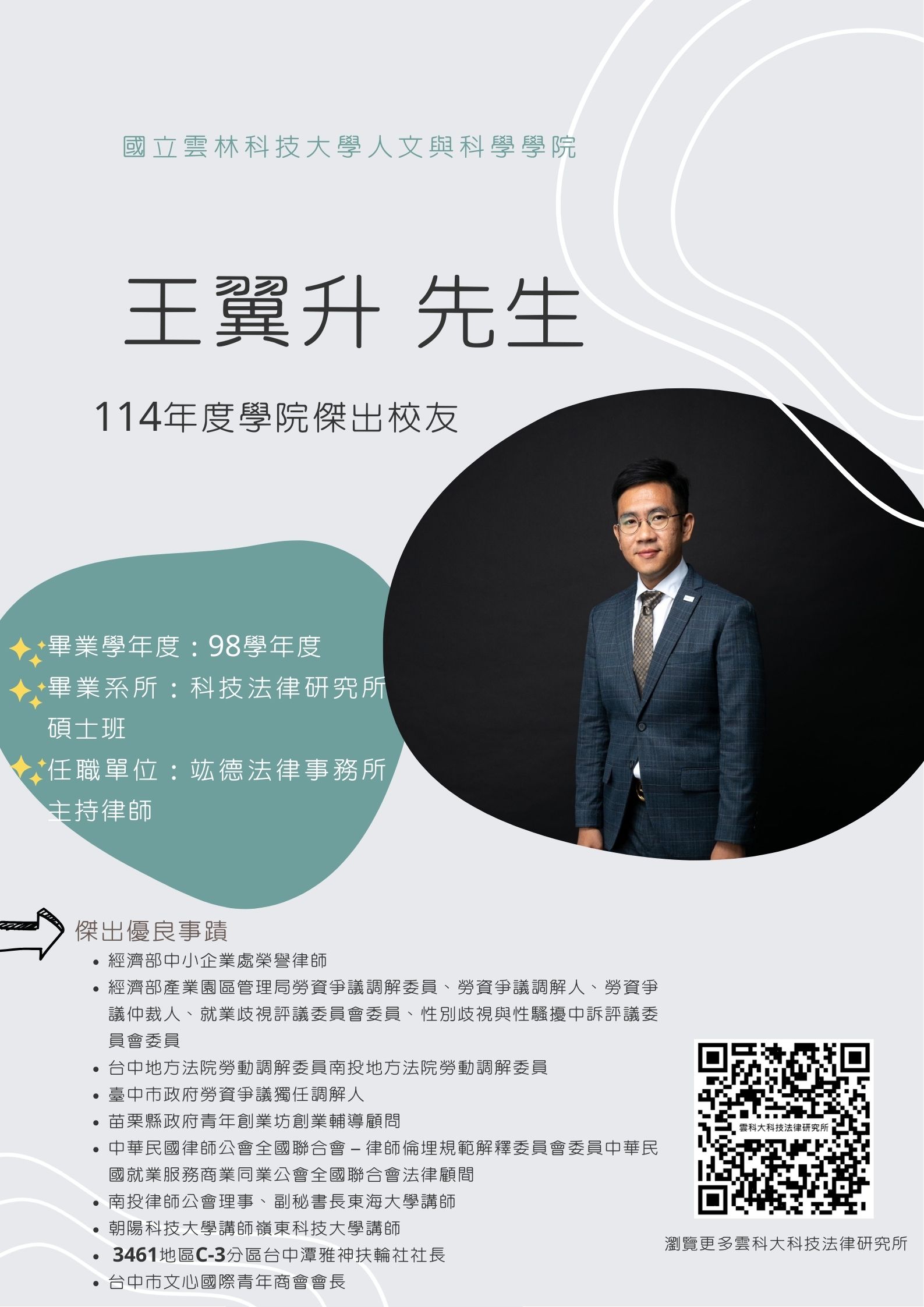 | 王翼升先生 | 98學年度 | 科技法律研究所碩士班 | 竑德法律事務所主持律師 |